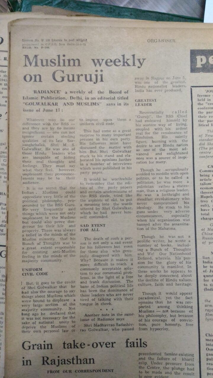 “ഡൽഹിയിൽ നിന്നും പ്രസിദ്ധീകരിക്കുന്ന ഇസ്ലാമിക് പബ്ലിക്കേഷൻ ബോർഡ് പുറത്തിറക്കുന്ന ആഴ്ചപ്പത്രമായ Radiance തങ്ങളുടെ ജൂൺ 17 ലക്കം, “Golwalkar and Muslims” എന്ന തലക്കെട്ടിൽ എഴുതിയ എഡിറ്റോറിയലിൽ, ആർ.എസ്.എസ്. സർസംഘചാലക് ആയിരുന്ന പരേതനായ ശ്രീ എം. എസ്. ഗോൾവൾക്കരെ സംബന്ധിച്ച് ഇങ്ങനെ പറയുന്നു: