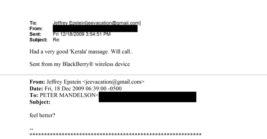 The Epstein Files, documents released by the U.S. Department of Justice in connection with sex offender Jeffrey Epstein, contain around fifteen direct references related to Kerala. In an email sent to Epstein by Peter Mandelson, a former British minister and ambassador who resigned from the Labour Party following controversies, he states: “Had a very good Kerala massage.” It is not clear whether this refers to a massage received in Kerala itself, or whether it was a service provided through some racket linked to Epstein. Notably, the word Kerala appears in quotation marks in the email.